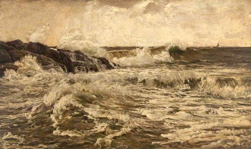 “Mr Crawford is perhaps chiefly in his element when he paints the sea, and particularly the sea in storm. One of the most spacious, as it is perhaps the finest picture in the collection, is ‘Storm at Portincross.’ There is a fine suggestion of reality about the white-crested waves. It is satisfactory to learn that this work is to become the property of the city. It has been purchased by Mr George J Kidston; who has generously decided to gift it to the municipal collection.”